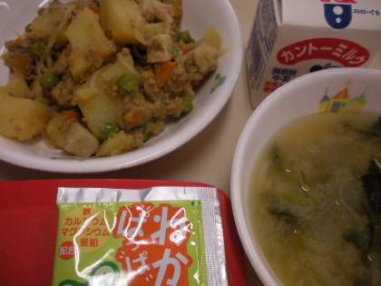 <献立>麦ごはん,牛乳,じゃがいものそぼろ煮,冬瓜のみそ汁,ふりかけ