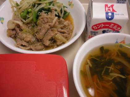 7月12日(木)給食 公開日 2012/07/12 更新日 2012/07/12 子どもたちの活動 <献立>麦ごはん,牛乳,豚肉と白滝のピリ辛炒め,中華和え,かにかまスープ 豚肉は疲労回復に役立つビタミンB1が豊富な食品です。にんにく,たまねぎ,にらなどと一緒に食べるとビタミンB1の吸収がよくなります。今日は「豚肉のピリ辛炒め」に豚肉とにんにく,「かにかまスープ」ににらとたまねぎが入っています。暑さで疲れた体にぴったりの献立です。