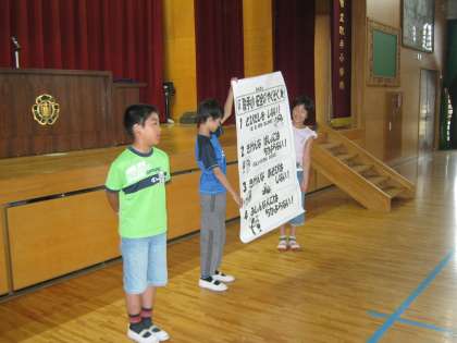 7月20日(金)に1学期の終業式が行われました。校長先生から夏休みに実践する大切なこととして,1,何日までに何をやるという目標を立てること。2,その目標は自分で決めること。3,大事なことから始めること。というご指導をいただきました。そして,最後に「心に残る夏休みにしましょう。」という優しいお言葉をいただきました。終業式の最後には,飛び出しをしない,危険な場所には近寄らない,危険な遊びはしない,不審な人には近寄らない,などの「取手小安全の約束」を全員で唱和して式を終えました。