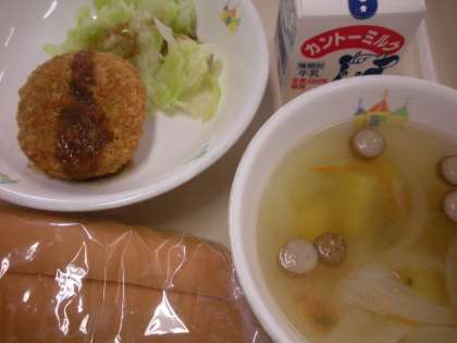 <献立>コッペパン,牛乳,メンチカツ,ボイルキャベツ,さつまいもとウインナーのスープ