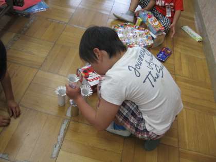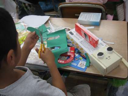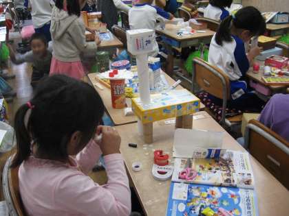 1年生図工「どうぶつむらのピクニック」 公開日 2012/09/28 更新日 2012/09/28 1年生 「紙箱を動物に変身させてピクニックにつれていこう」と思い思いに集めてきた紙箱を前にどんな動物を作ろうかなと楽しそうに考えていた子どもたち。あれこれと箱を組み合わせてキリンや象,うさぎやカバなど,楽しい動物園ができました。化学接着剤を上手に使って箱をつなぎ合わせるのも上手になりました。できあがった作品を前にとても満足そうな笑顔がいっぱいの教室になりました。