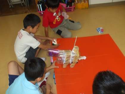 コロコロ大さくせん! 公開日 2012/09/28 更新日 2012/09/28 2年生 図工「コロコロ大さくせん!」では紙コップやビー玉などを使って転がるおもちゃ作りをしました。かわいい動物を作ったり,学校や山など動かないものを作ってみたりしました。 「山が動いてる!」「歩くハムスターがかわいい!」 作品ができあがると次々に坂で転がし,ニコニコ笑顔の子どもたちでした。
