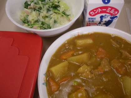 10月2日(火)カレー 公開日 2012/10/02 更新日 2012/10/02 子どもたちの活動 <献立>麦ごはん,牛乳,カレー,水菜のサラダ 10月最初の給食は不動の人気を誇るカレーです。給食のカレーは,みんなが食べられるように辛さを控えめにしています。たくさん作るので,とてもおいしくできます。サラダは水菜とキャベツとロースハム。チーズ味噌ドレッシングでいただきます。