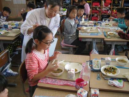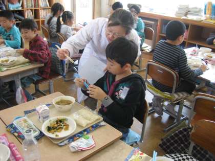 給食の時間に、栄養教諭の戸高先生が「はしの正しい使い方」を教えてくださっています。グループごとに、一人一人の指先を丁寧にみてくれます。今日は3つのグループの子どもたちに個人指導をしてくださいました。