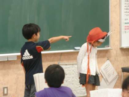 国語では物語「名前を見てちょうだい」を学習しています。えっちゃんやきつね,牛,大男などおもしろい登場人物がたくさん出てきます。音読もどんどん上手になってきました。「こら,ぼうし,まてえ。」とすっかりえっちゃんになりきっている子どもたち。国語の授業を楽しみにしているようです。