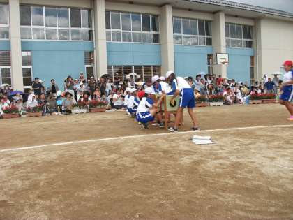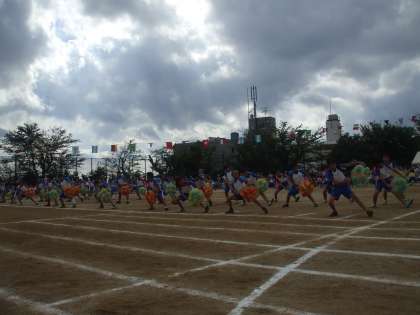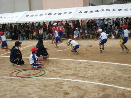 障害物競走「よく見て走れ!赤・青・黄!!」は,はてなボックスの中から引いたバンダナの色によって,青ならそのままゴールへ,黄ならフラフープをくぐって,赤なら待ち構える5・6年生と勝つまでじゃんけんをしてからゴールへ向かう競技です。最後に大逆転劇もあり,楽しく激走しました。