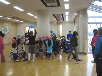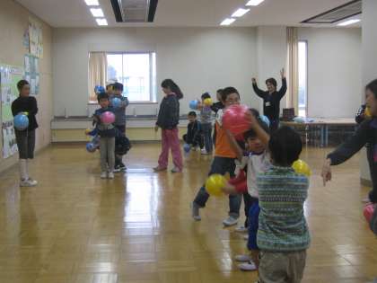 ボール運動では「夢の中へ」の曲に合わせてボールを使いながら
