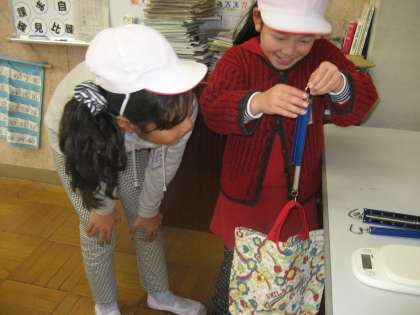 算数で、重さについて学習しました。台ばかりで、辞典や楽器、ランドセルなどはかってみました。さらに、手に持って「1kgってこんな感じ・・・」と体感してみました。「けっこう重いね。」