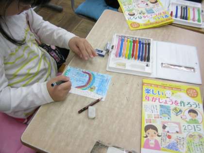 1年生 年賀状を書きました。(知性みがき) 公開日 2014/12/06 更新日 2014/12/06 1年生 生活科の学習で年賀状を書きました。 表に書く、郵便番号・住所・宛先の書き方を教えました。葉書の大きさと字数を考えて読みやすい字で書くように伝えたら,みんな丁寧に書いていました。 裏には新年の挨拶と年賀状に合うような絵を描きました。来年の干支である羊の絵を描いたり富士山を描いたりと,子ども達の個性が現れた年賀状が仕上がりました。