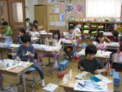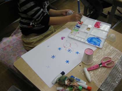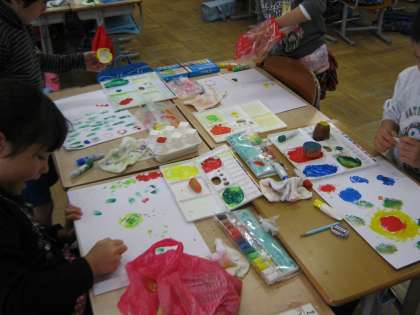 1年生 うつしてあそぼう(知性みがき) 公開日 2014/12/12 更新日 2014/12/12 1年生 図画工作科の学習で持ってきた素材に絵の具をつけて,写し絵遊びをしました。 子ども達も保護者の方と,持ってくる素材はどのような物を用意したら良いかを相談して様々な素材を持ってきてくれました。野菜の切れ端やプリンカップなどに絵の具をのせ画用紙にスタンプすると,画用紙に形が写ります。写した形を組み合わせておもしろい模様や素敵な絵を描きました。