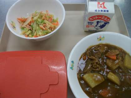 今日の献立(体力みがき) 公開日 2015/01/08 更新日 2015/01/08 子どもたちの活動 1月8日(木)(体力みがき) <献立>ごはん 牛乳 カレー ツナサラダ 今日から3学期が始まりました。しっかり食べて,元気に過ごしましょう。