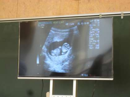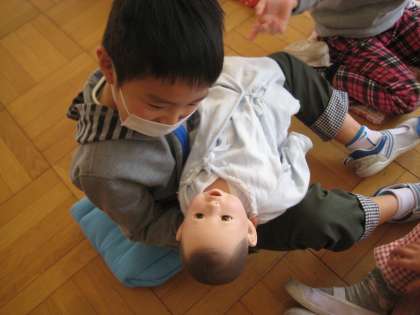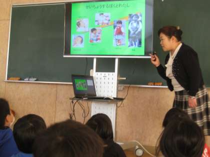 赤ちゃんがお腹の中で動いている様子や出産の様子を見ることができ,たくさんの人に支えられて産まれてくることを知りました。ビデオを見たあとは,赤ちゃんの抱き方を教えていただき,実際に赤ちゃんの人形を抱きました。子ども達から「赤ちゃんってこんなに重いんだ。」「お母さんは痛い思いをして自分のことを産んでくれたんだ。」「自分が産まれてくるときも,たくさんの人たちに助けられたんだ。」などの感想がありました。