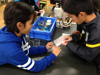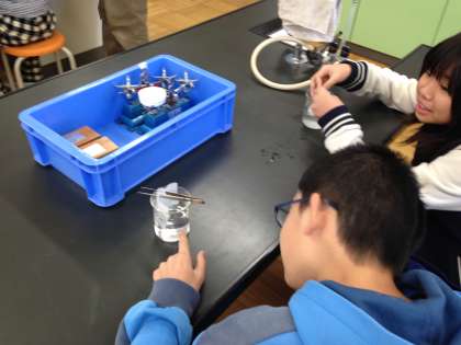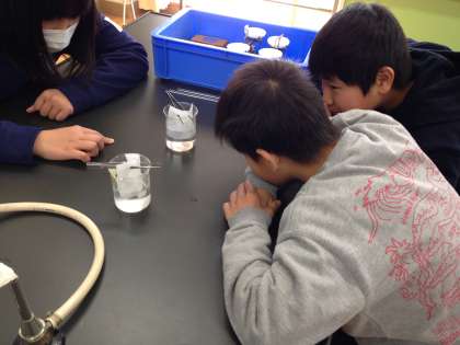 5年生の理科では,もののとけ方の実験を行いました。氷砂糖と片栗粉を水に入れて変化を観察しました。氷砂糖が溶けていく様子や片栗粉が下にたまっていく様子をしっかり観察することができました。