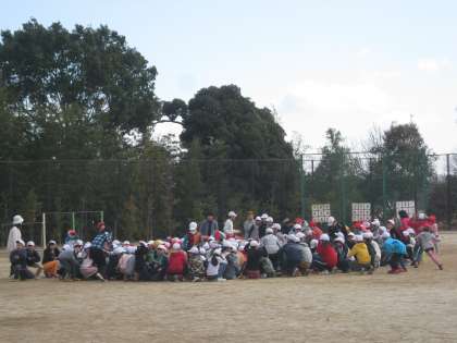 避難訓練の放送が流れると、校庭で遊んでいた児童は中央に集まり、
