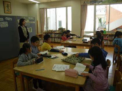 国語の「図書館へ行こう」の学習で,図書館司書の林先生から図書室の使い方や本のグループ分けについて学びました。1年間で50冊以上を目指し,早速お気に入りの本を借りていました。