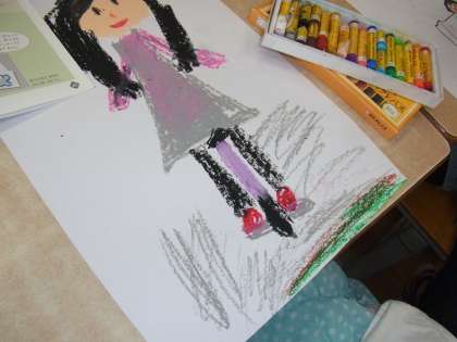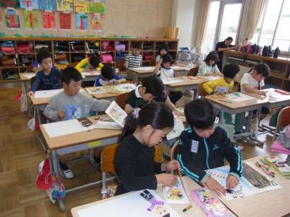 図工で「すきなことなあに」の絵を描いています。友達と遊ぶこと,野球をすること,たこあげをすること,なわとび,などなど…。