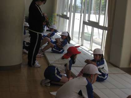 今日は5年生に手伝ってもらい、シャトルランや反復横跳び、上体起こしに挑戦しました。
