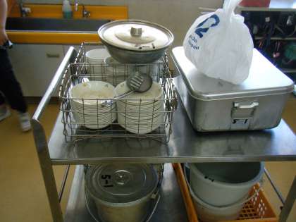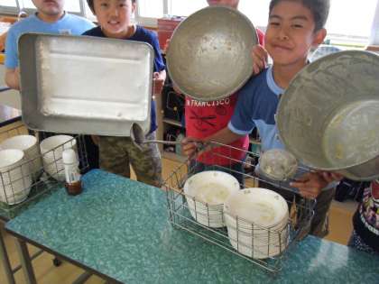 今日の給食のメニューはシチュー,サラダ,米パンです。サラダには数種類の豆が入っていて苦手に感じる児童もいましたが,食べられる量を調整し,全員が完食しました。「苦手なおかずでも一口は食べよう。」とお互いに声をかけあっています。
