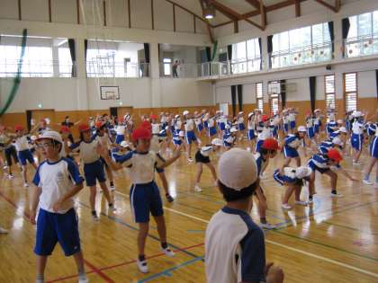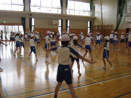取小の伝統「ソーラン節」の練習が今年も始まりました。毎年6年生が振り付けを5年生に教えています。少しずつ,でも確実に動きを覚える5年生。そして顔の向きや手足の動きなども熱心に教える6年生。明日は外に出て練習をする予定です。
