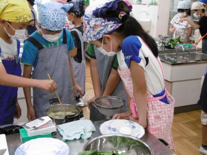 初めての調理実習を子どもたちはとても楽しみにしていて,1組の子どもたちは何日も前から「エプロン,三角巾,マスク,OK!」と張り切って準備をしていました。今日は全員忘れ物もなく,清潔・安全に気を付けてゆで野菜の調理実習を行うことができました。