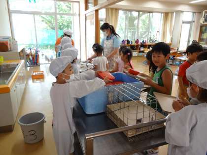 こぼさないように気を付けながら,一生懸命配膳をしています。