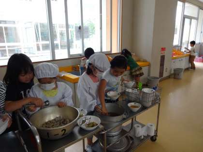 6年生の手伝いからも卒業した今週は,前の週の当番が新しい当番に配膳のやり方を教えてあげる姿も見られました。
