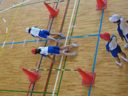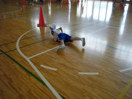 この動きは胸の筋肉を鍛えるための運動です。手だけを使って移動します。