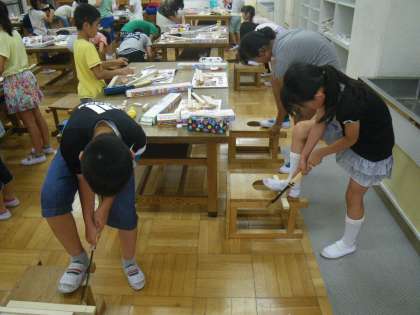 図工の時間にのこぎりを使って,木材を切り,いろいろつないで作品を仕上げる「ギコギコ,コロコロ,たのしいなかま」を行いました。のこぎりを上手に使い,まるで大工さんのように男子も女子も手際よく木材を切っていました。何ができるか今から楽しみです。
