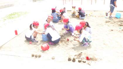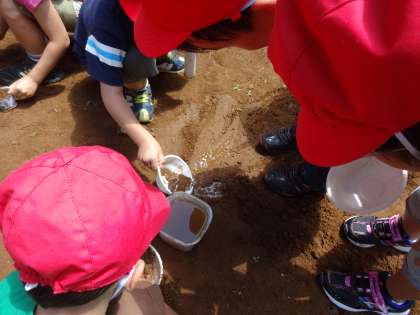 容器をつかってケーキを作る子や,溝を掘って川を作る子など,みんな土の特性を生かしながら思い思いの活動を行いました。