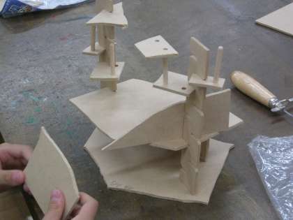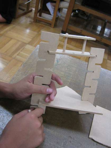 糸のこぎりを使いながら思い思いに木の板を切り,木のパーツを作っていきました。直線に切ったり,曲線に切ったり・・・。さらに,できたパーツを組み合わせていきます。組み合わせた形は何に見えるでしょう?