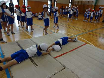 今日は,楽しみにしていた水泳学習があいにくのお天気でできず,4年2組は1年生と一緒にマット運動で体を動かしました。手をにぎってリードしたり,お手本になったり,マットの準備や片付けも進んで行い,頼もしいお兄さんお姉さんの姿が見られました。