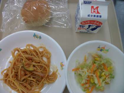今日の献立(体力みがき) 公開日 2015/07/15 更新日 2015/07/15 子どもたちの活動 7月15日(水)(体力みがき) <献立>ツナトマトスパゲティ 牛乳 コールスロー バターロール 今日は,ズッキーニという野菜を,ツナやトマトと一緒にスパゲティに入れました。
