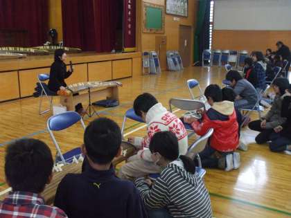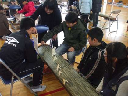「日本の音楽」教室 公開日 2012/02/15 更新日 2012/02/15 子どもたちの活動 2月15日(水) 和楽器の講師の先生をお招きして,5年生と6年生が音楽の時間に箏と尺八の勉強をしました。 初めてふれる楽器に緊張しながらもすてきな音色に感激をしていました。 「さくら」をみんなで演奏できるようになりました。