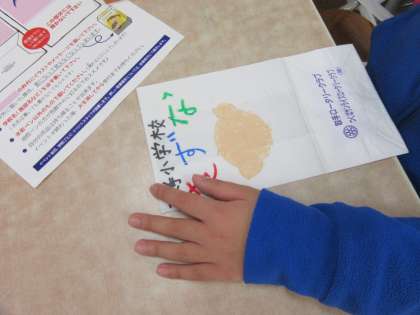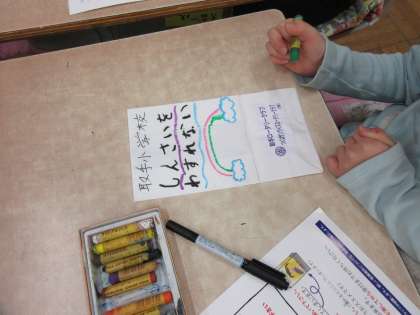 取手藤代庁舎でひらかれる「ゆめあかり3.11〜続ける祈り,繋がる想い〜」におくるメッセージを紙袋に書きました。震災当時のことはあまり覚えていない子も多くいましたが,お家の人と一緒に逃げたり,大きな揺れに驚いたりした記憶がある子もいました。