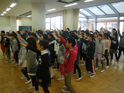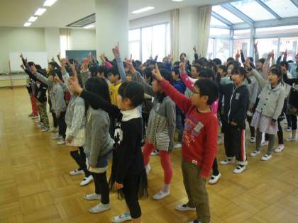 21日の6校時にありがとう会に向けての振り付け練習を行いました。「世界に一つだけの花」の歌に合わせて,石川先生に教えていただきました。すでに知っている児童もいましたが,全員が共通した振り付けを覚えることができました。歌が上手な3年生。振り付けもがんばっています。
