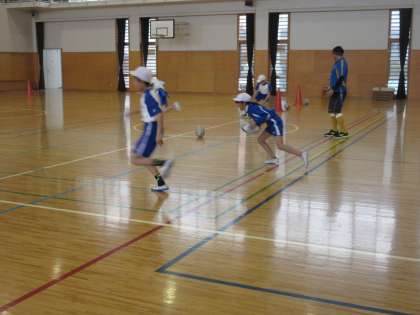 後半はタグを腰につけ、友達と取り合う練習をしました。ディフェンスの間をどうやって通り抜ければいいのかを考えながら楽しく活動しました。