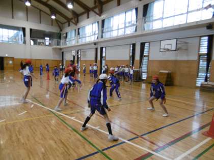 タグラグビー教室(体みがき) 公開日 2017/02/24 更新日 2017/02/24 4年生 今日はコーチをお招きして,タグラグビー教室を行いました。タグラグビーとは,ラグビーのルールをもとに,体の接触を比較的少なくしたスポーツで,腰にタグを付けながら行われます。 初めてのタグラグビーに子どもたちは大興奮で,夢中になりながら取り組んでいました。2時間通しで行われましたが,終わった時には皆良い顔をしていて,「またやりたいね」と話してしました。
