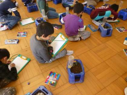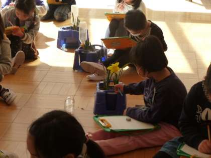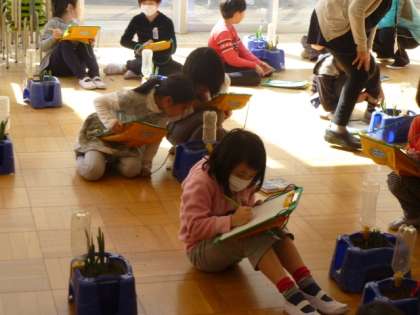 つぼみの様子をじっくり観察したり、茎の伸び具合を測ったりして、観察カードに細かくまとめていました。