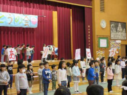 1年生は,お世話になった6年生に向けて,「白くまのジェンカ」のダンスと歌,「こいぬのマーチ」の合奏を発表しました。