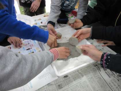じゃがいもを切り、その切り口に灰(草木灰)を付けると聞いた子どもたちは、驚きの声を上げていました。