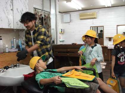 美容院では,お客さんがカットする椅子に座らせてもらったり,美容師さんの道具をいろいろと紹介してもらったりしました。