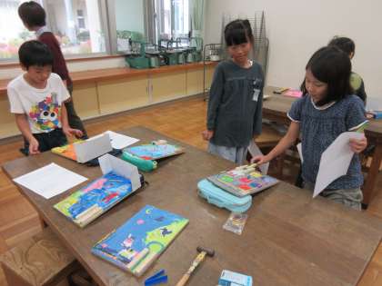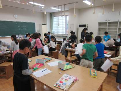 くぎうち名人 鑑賞会 公開日 2017/10/10 更新日 2017/10/10 3年生 一月行ってきたくぎうちの作品作りも,今日の図工で完成となりました。今日は鑑賞会を行い,友達が作ったゲームで実際に遊んでみたり,友達の作品の良いところを見つけたりしました。 子どもたちは友達の作品で遊ぶことができるのを楽しみにしていたようで,皆で楽しい鑑賞会にすることができました。