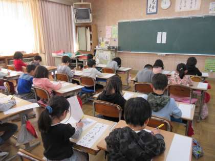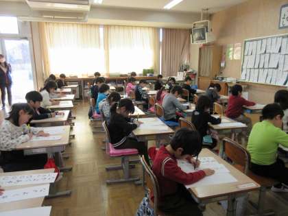 「春の海」の音楽の流れる教室で,冬休みに練習した「なかよくあそぶ」を書きました。文字の大きさや間隔に気を付けて真剣に書くことができました。