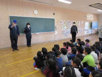 今日は,5時間目に1組のベランダ側のドアから不審者が来たという想定での訓練でした。事前にスクールサポーターの方が,訓練の説明をしてくださいました。その後,訓練をしました。1組の子どもたちは,静かに2組に逃げ,1年生全員ですばやく体育館に避難することができました。