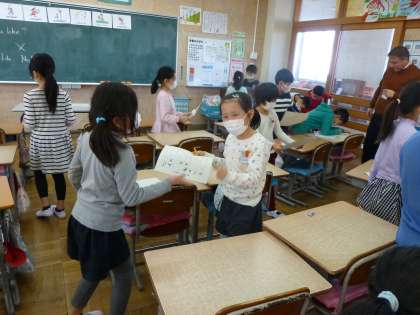 今週の英語活動では,スポーツの名前を学習しました。スポーツの動作をしながら,単語を覚えていきました。その後,子どもたち同士で好きなスポーツをインタビューし合いました。楽しく取り組んでいました。