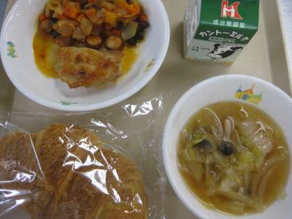 <献立>クロワッサン 牛乳 鶏の香草焼き