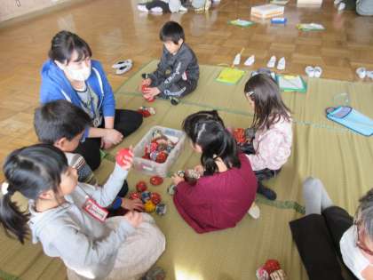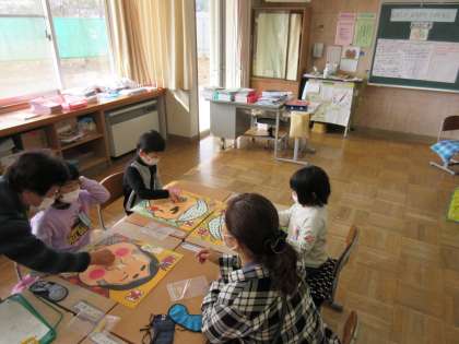 生活科の学習で,「こま」「けん玉」「お手玉」「メンコ」「だるまおとし」「あやとり」「おはじき」「ふくわらい,すごろく」の遊びをしました。