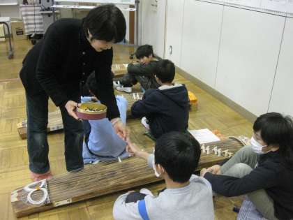 箏の水野先生をお招きして,体験活動を行いました。指に演奏用の爪をはめ,一つ一つの音を確かめながら弾きました。ぎこちなかった手もなめらかに動くようになり,最後は全員で「さくら さくら」を演奏することができました。