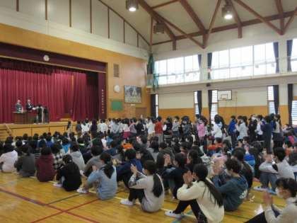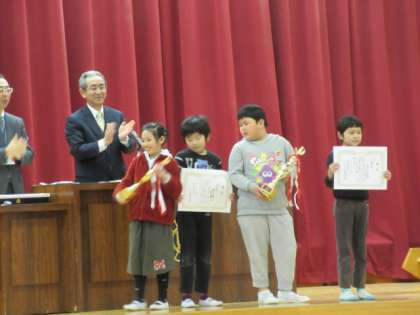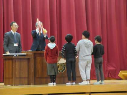 28日の全校集会で,1月に出場した凧揚げ大会の表彰をしました。名前を呼ばれるとクラス全員で返事をして立ち,代表の子が賞状とトロフィーを受け取りました。みんなで力を合わせた凧揚げで優秀賞となり,みんなうれしそうでした。