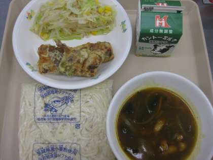 <献立名>カレーうどん 牛乳 ちくわの磯辺揚げ